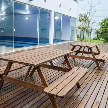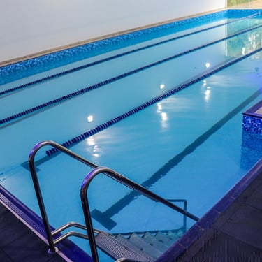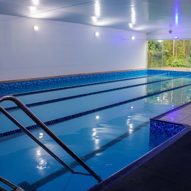 Piscina coberta, aquecida e tratada com ozônio, pensada para conforto, segurança e desempenho na água.